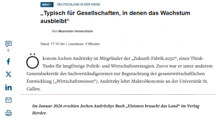 Zur Premiere seines Buchs schreibt ZF.2050-Mitinitiator Jochen Andritzky im Handelsblatt vom Freitag, 16. Januar 2026. „Statt Scheinlösungen verdienen die Wähler eine Politik der großen Linien,“ so der Autor. „Mut zu