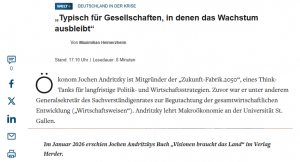 Zur Premiere seines Buchs schreibt ZF.2050-Mitinitiator Jochen Andritzky im Handelsblatt vom Freitag, 16. Januar 2026. „Statt Scheinlösungen verdienen die Wähler eine Politik der großen Linien,“ so der Autor. „Mut zu
