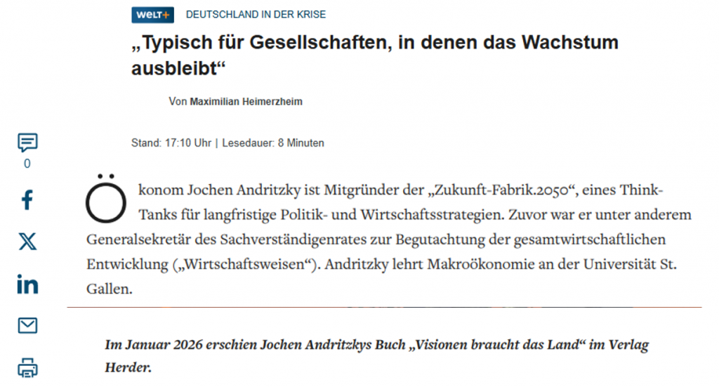 „Gerade in Zeiten des Umbruchs brauchen Menschen Orientierung, und diese zu geben, ist eine zentrale Aufgabe der Politik,“ sagt Jochen Andritzky, Mitgründer der Zukunft-Fabrik.2050 und Autor des Buches „Visionen braucht das Land“ im WELT Interview vom 3. Februar 2026.